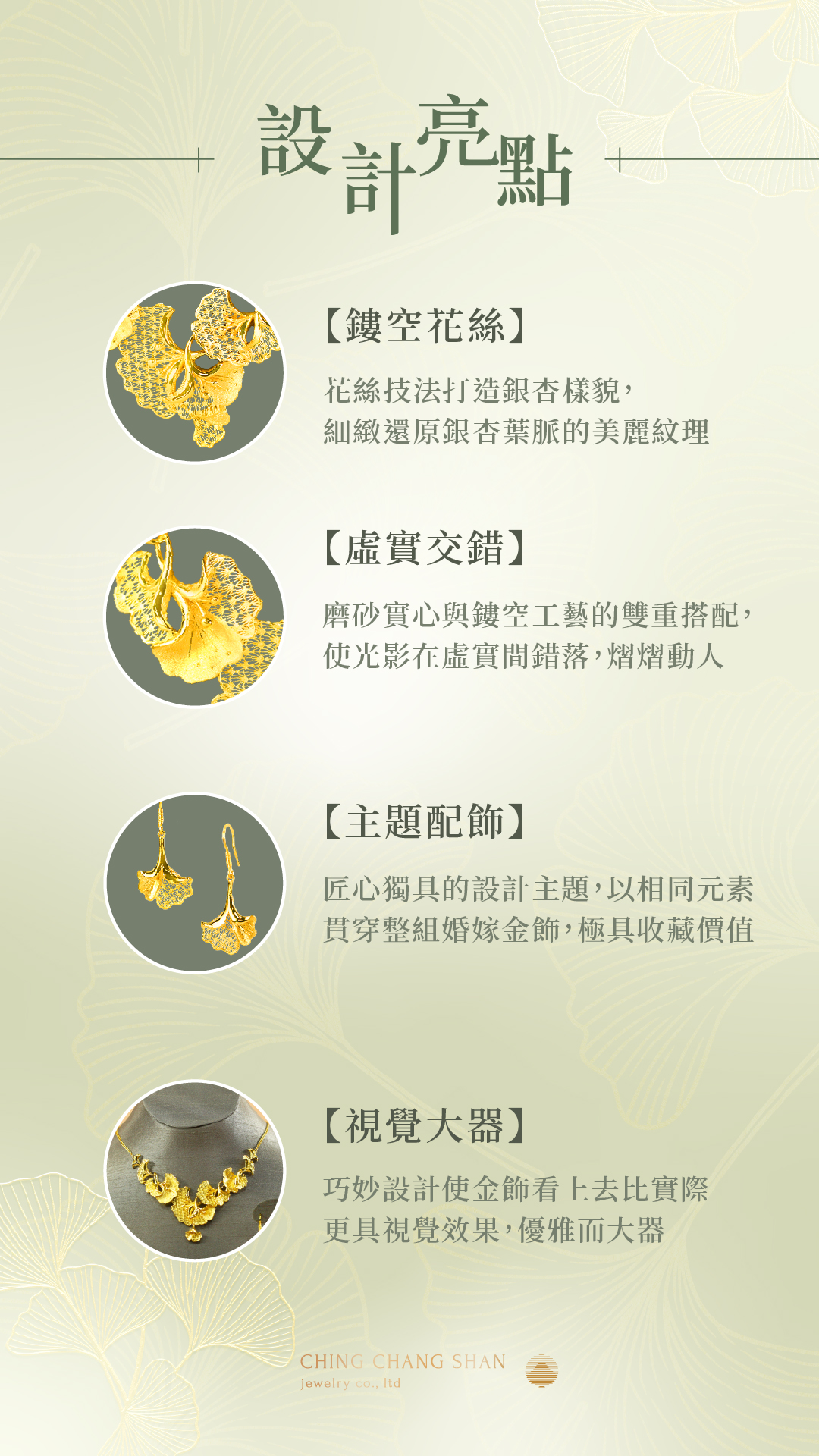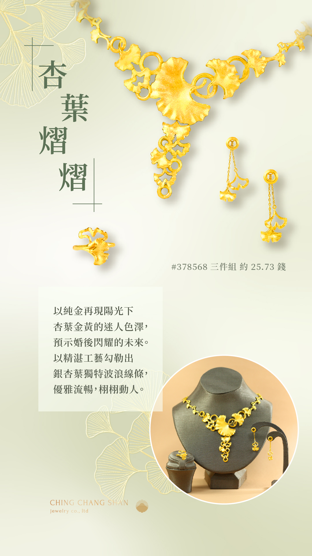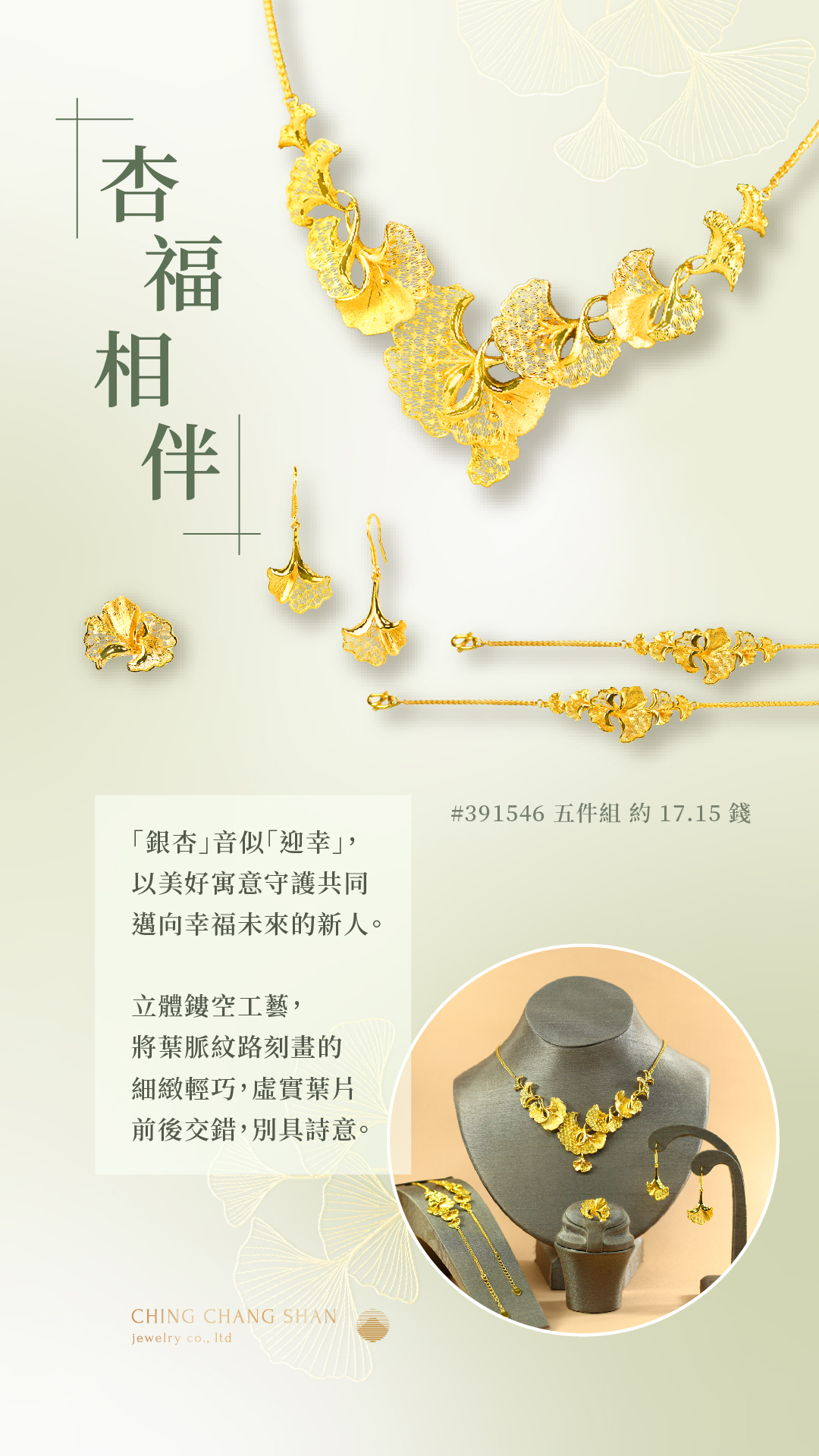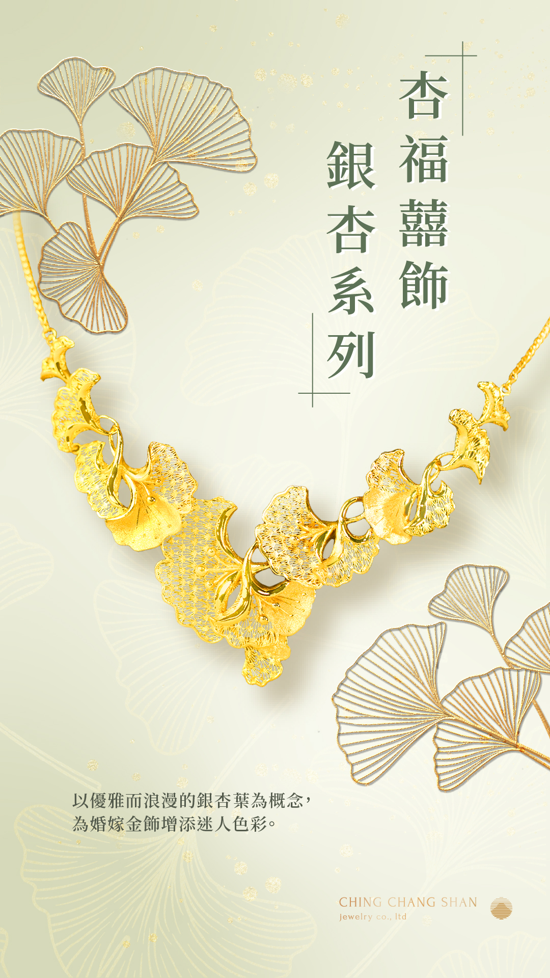杏福囍飾以優雅而浪漫的銀杏葉為概念,打造別出心裁的婚嫁金飾,為您的愛情故事增添迷人色彩。