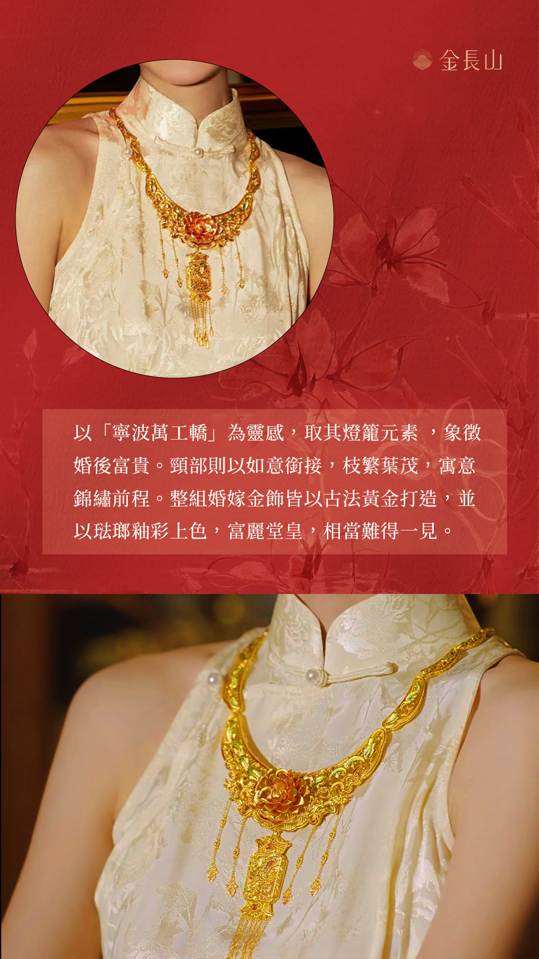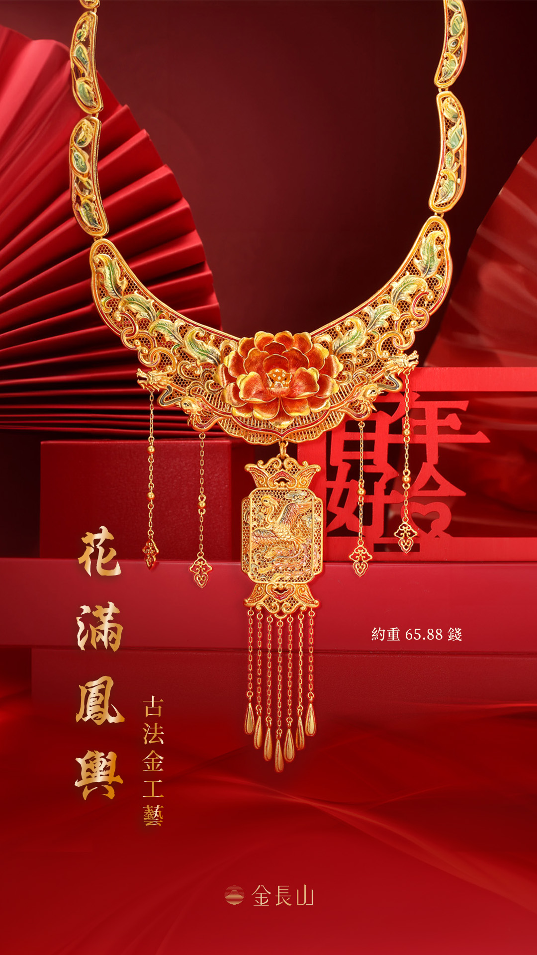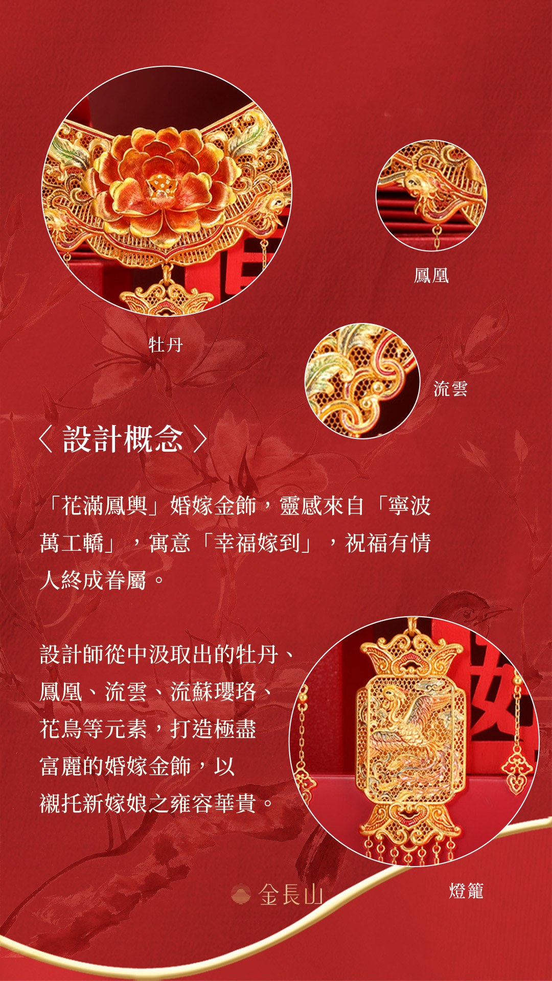 設計師從中汲取牡丹、鳳凰、翔雲等祥瑞元素,融入婚嫁金飾中,襯托新娘的雍容華貴,寓意「幸福嫁到」。全古法黃金打造,佐以明豔琺瑯上色,富麗大器,難得一見,再現十里紅妝的奢華盛世。