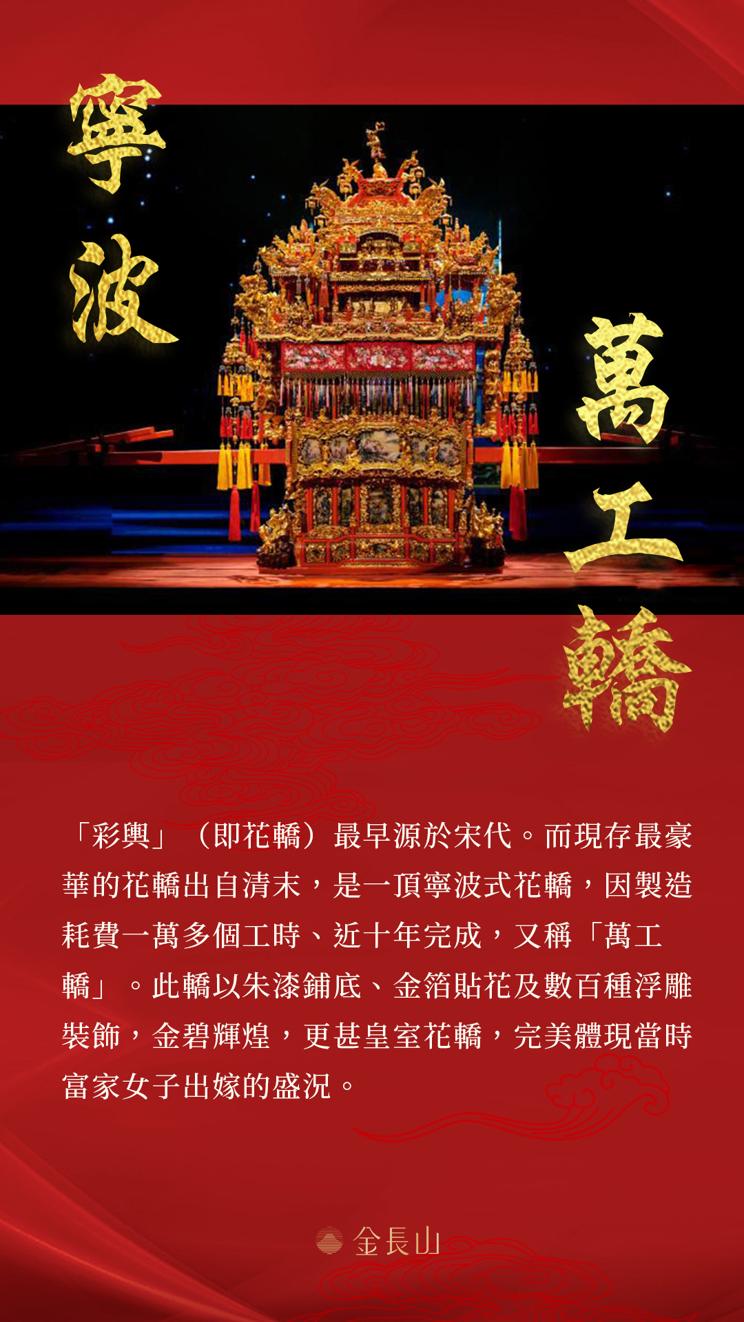 「彩輿」(即花轎)為古代富家女子嫁妝的重要物件之一。「花滿鳳輿」靈感來自現存最奢華的花轎-清代「寧波萬工轎」。寧波萬工轎以朱漆鋪底、金箔貼花搭配數百種手工浮雕,金碧輝煌,更甚皇室花轎,製造耗費一萬多個工時,故得其名。