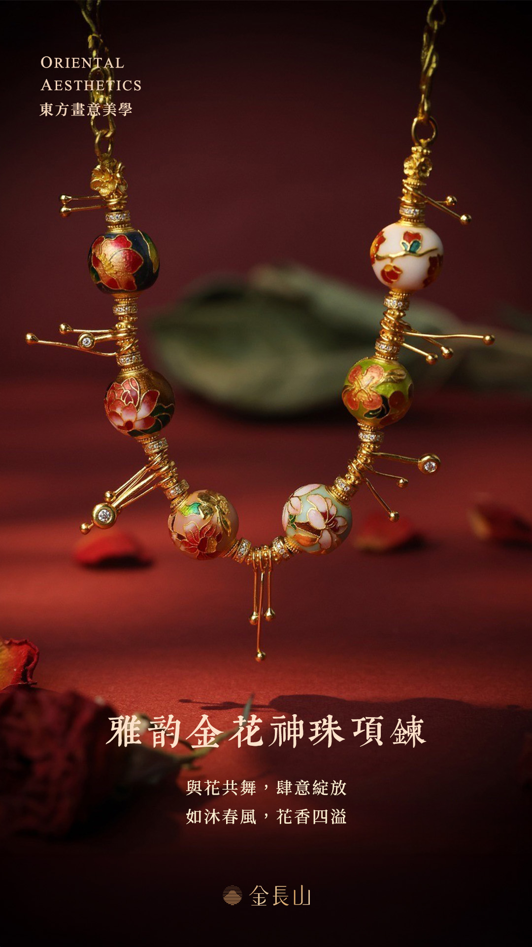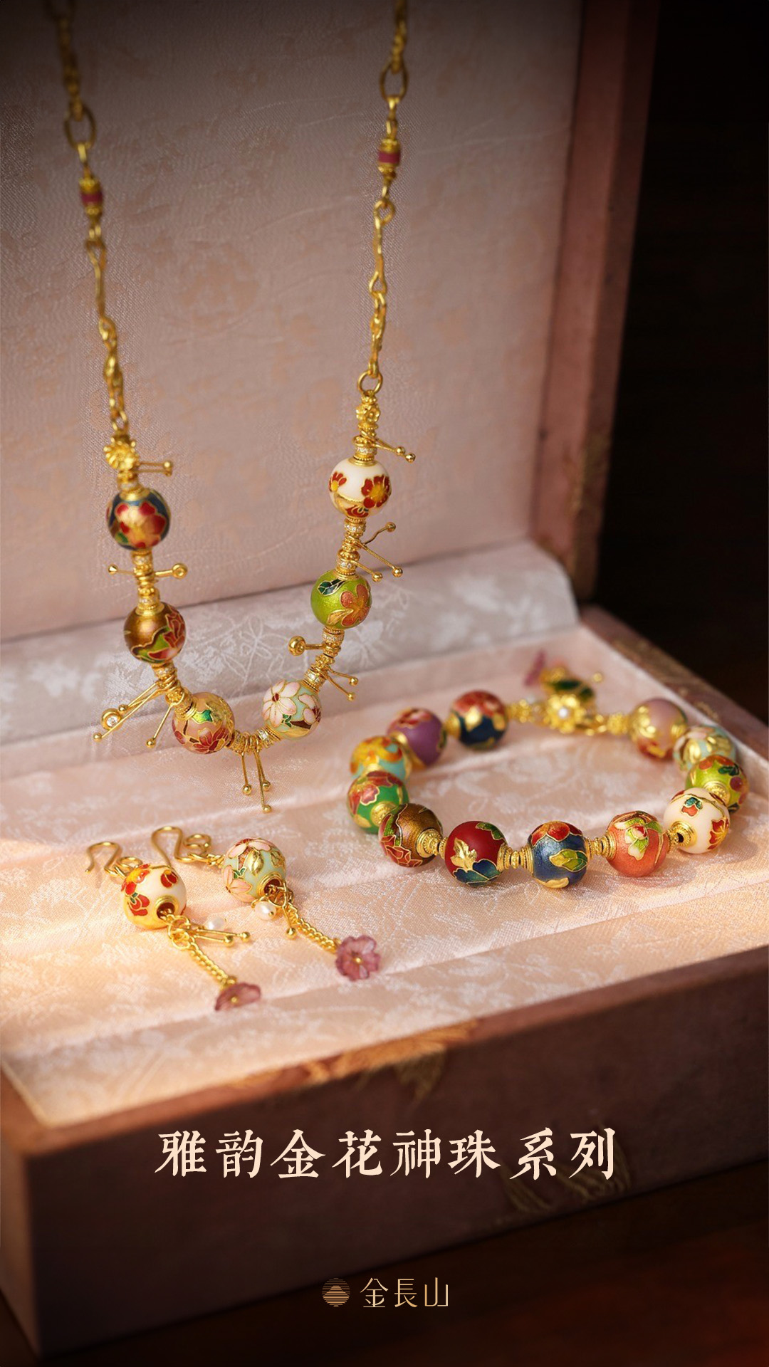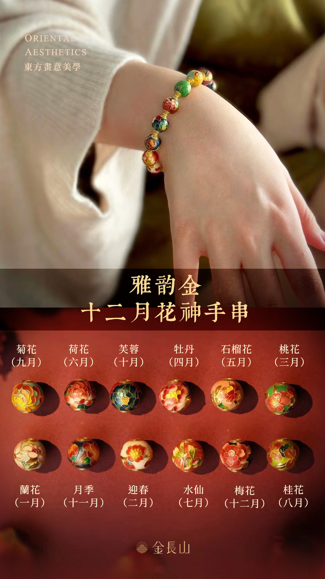 以十二月花神珠打造的系列金飾,手串、耳飾、項鍊,繽紛色澤隨著光影搖曳。美輪美奐的釉色,暈染出十二月花的不同韻味。古法高溫燒藍,非遺大師設計。以匠心工藝燒製出如夢似幻的動人色澤。可優雅、也華麗、或嬌嫩、亦可人。