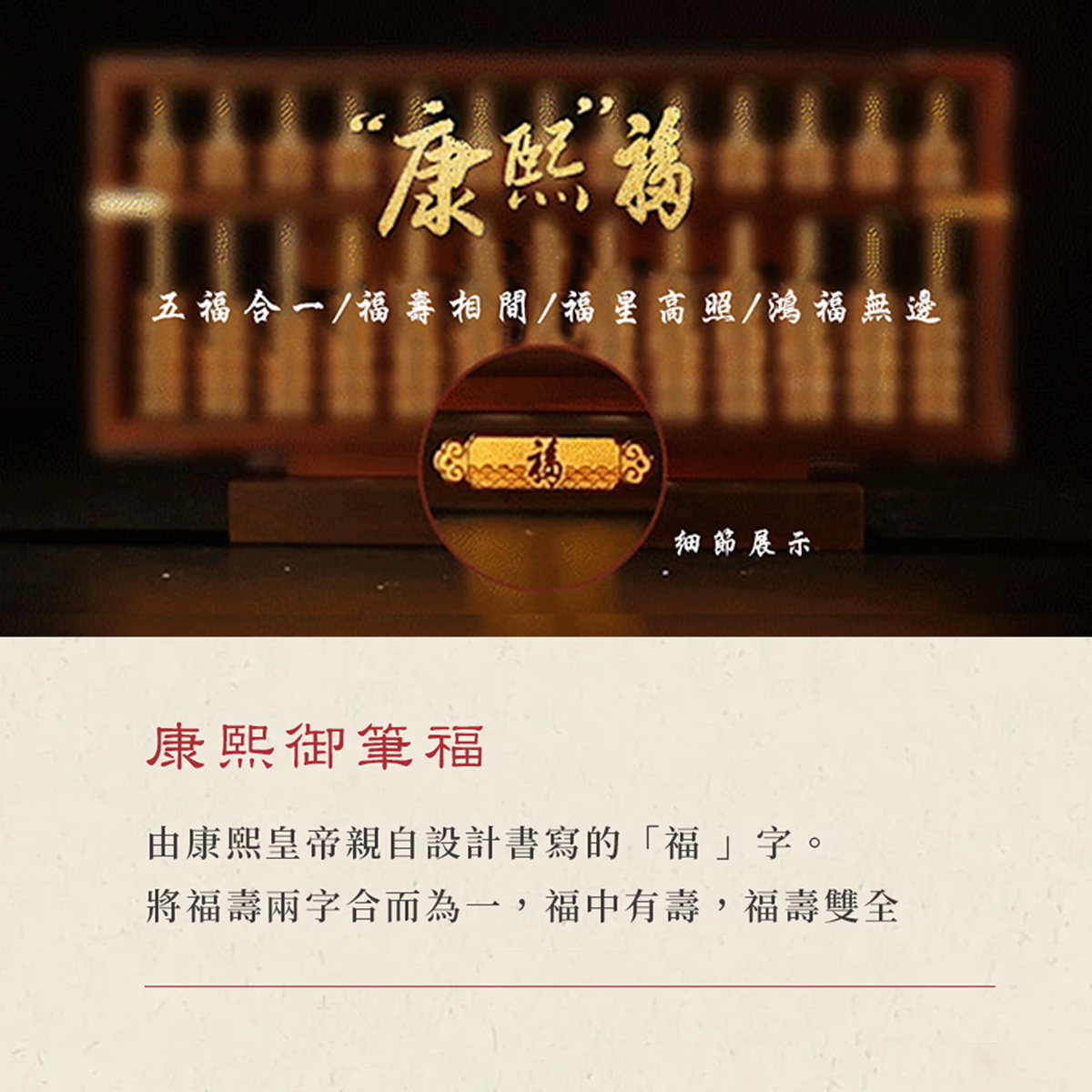 採用古法金工藝製作,雕花鑿刻 · 層次細膩。集合康熙皇帝御筆設計的「福」字 及各種宮廷吉祥紋飾,匠心細節,招財納福,送禮鎮宅收藏皆大器!