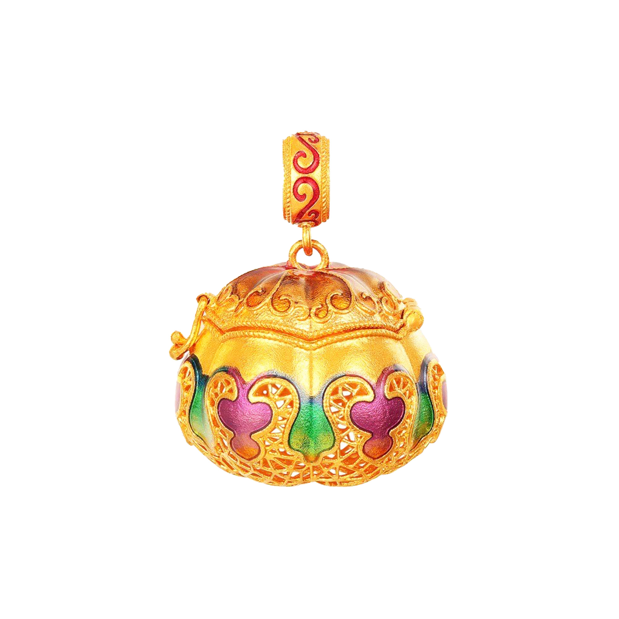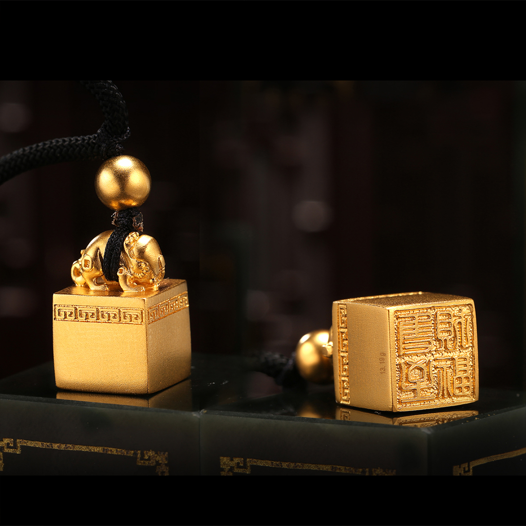 印鈕,本為印璽上孔洞之處,使之穿繩結綬以繫於身,爾後發展成有身分地位辨識的功能,例如傳國玉璽、王公諸侯、將軍節度使等等不同鈕式裝飾。此款設計來源取自漢代貔貅,貔貅納食四方之財,只進不出,印身回形紋象徵財福連綿不斷。