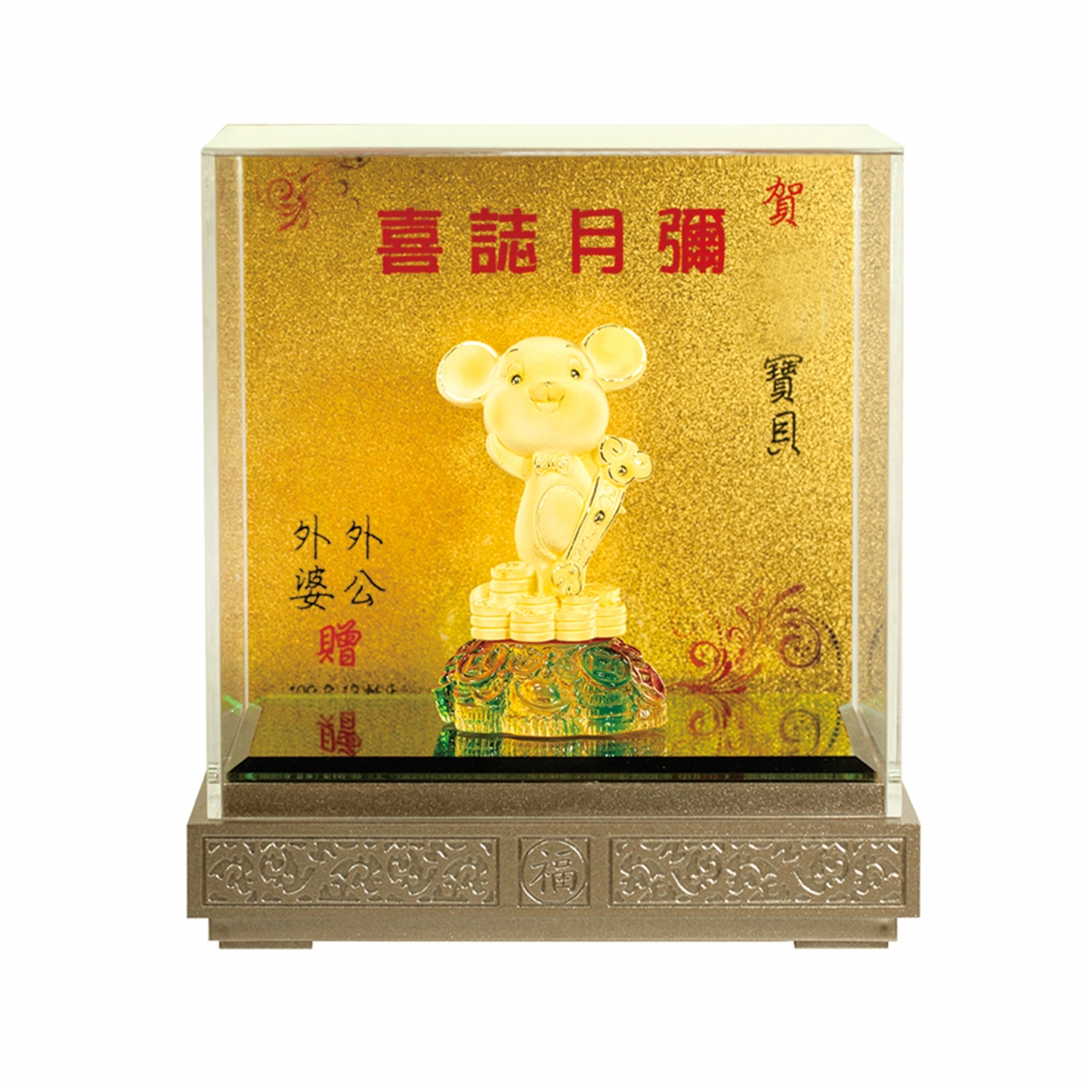 客戶挑選生肖鼠擺件做為彌月賀禮,並加上客製化題字祝福金卡 ,純金賀禮大方誠意又具保值性!