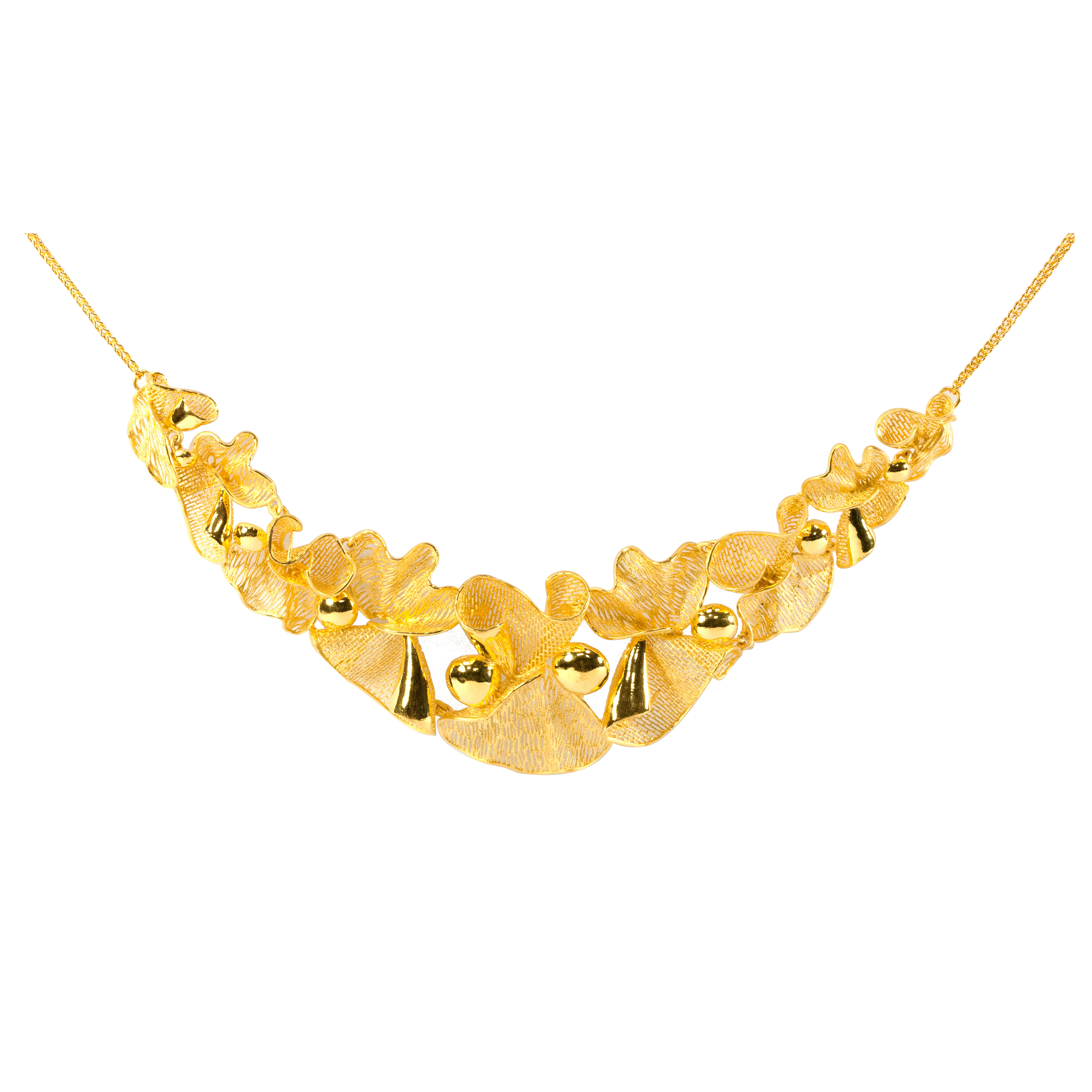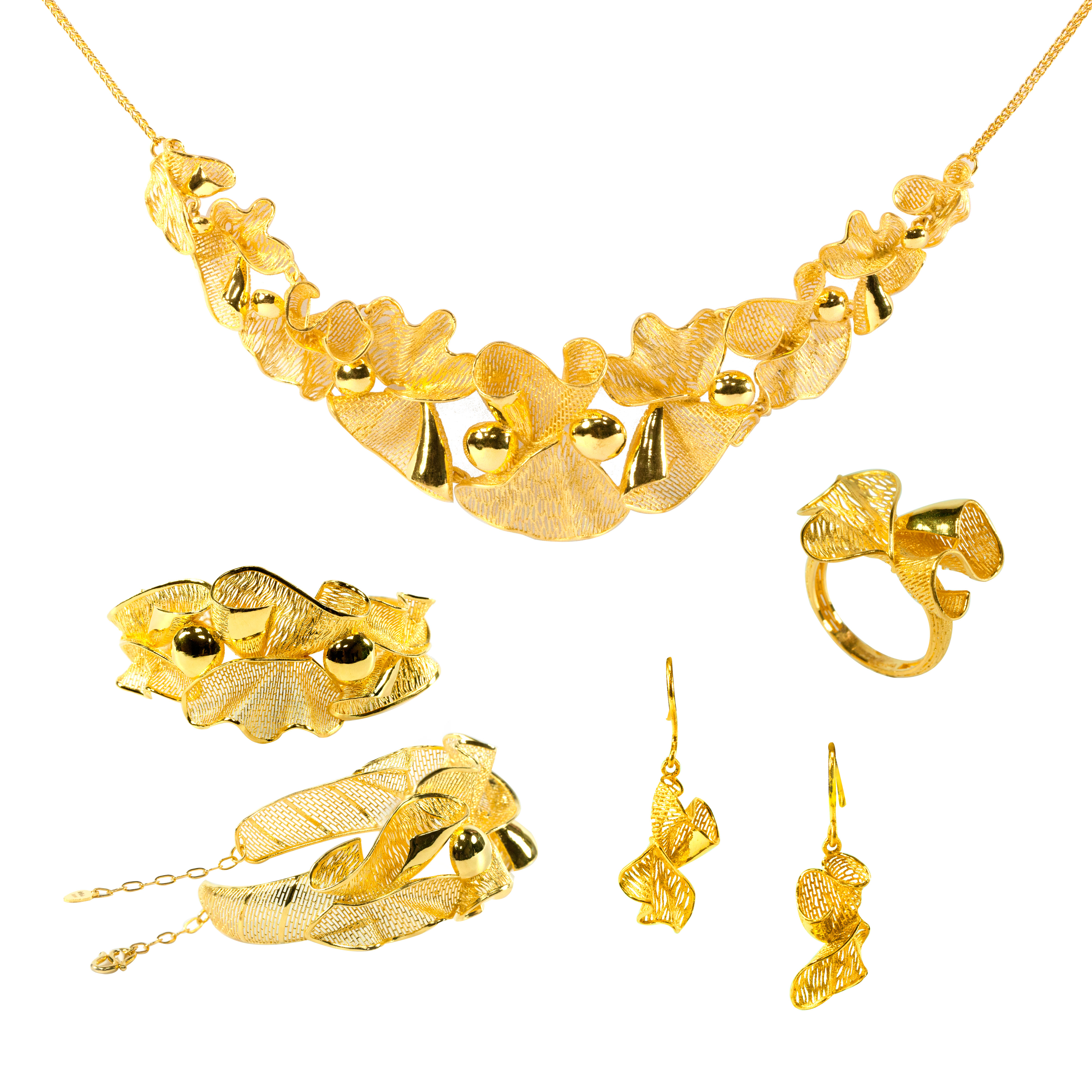 採用花絲編織工藝,充滿流動感的線條,像極了白紗上的蕾絲滾邊,流線設計的純金工藝象徵愛生生不息。