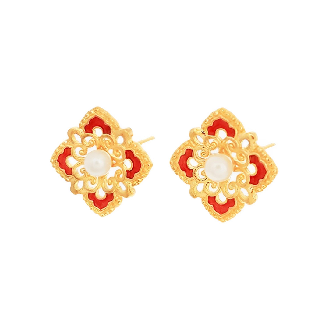 正當紅鎏彩珍珠耳環